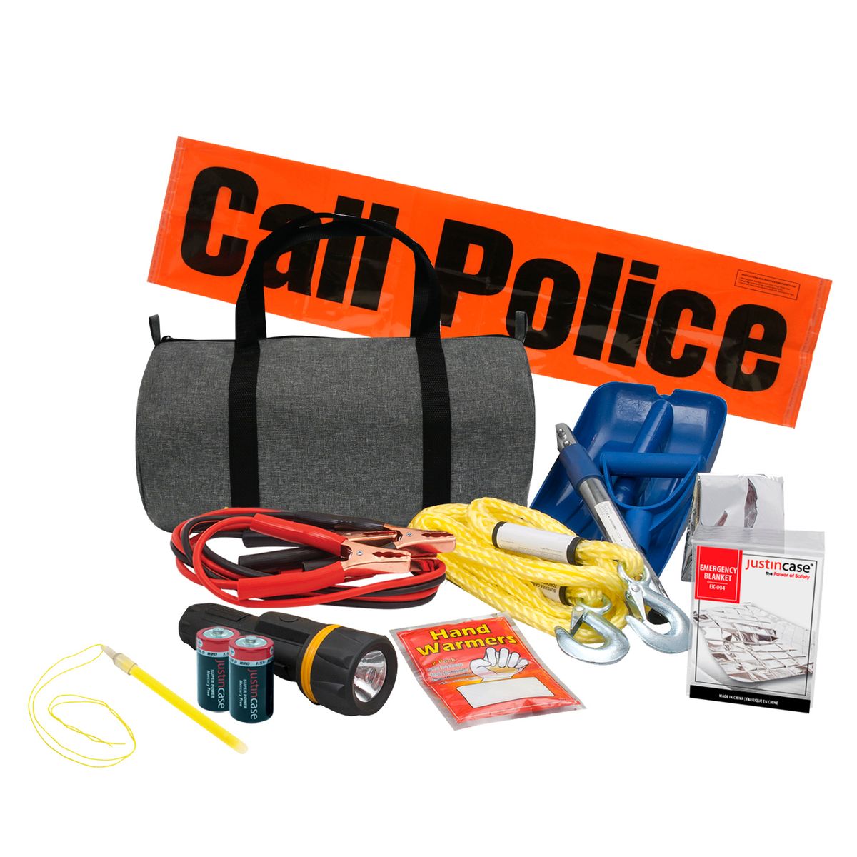 Includes collapsible 3 Piece Shovel which includes hi-impact blade (12"x6.25"), lightweight aluminum alloy telescoping shaft (33" fully extended) with reinforced 2-position smart locks, and handle. 8 Foot, 10 Gauge Booster Cables w/ instructions. 12' Tow Rope w/ Locking Steel Hooks (2-ton capacity). Rubberized Flashlight w/ 2 mercury-free heavy-duty "D" batteries. Emergency Mylar Blanket. Instant Hand Warmer Two-Pack. Light stick.