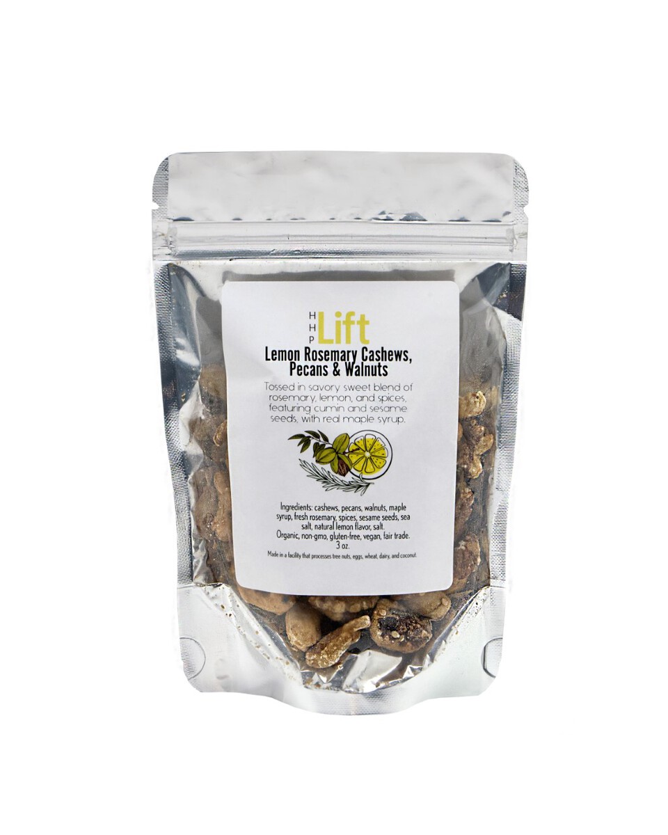 Tossed in savory sweet blend of rosemary, lemon, and spices, featuring cumin and sesame seeds, with real maple syrup. Ingredients include cashews, pecans, walnuts, maple syrup, fresh rosemary, spices, sesame seeds, sea salt, natural lemon flavor, salt. Made in a facility that processes tree nuts, eggs, wheat, dairy, and coconut. Non-GMO Vegan, Paleo, Gluten-free, Fair Trade. Made in a facility that processes tree nuts, eggs, wheat, dairy, and coconut.